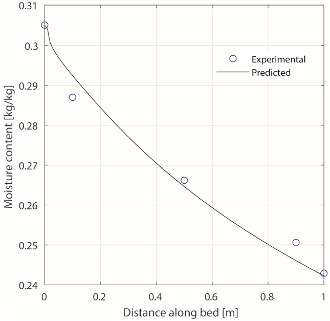 In this study, a mathematical model to simulate the drying of shelled corn in a continuous plug-flow fluidised bed dryer is presented. Equipment and material models were applied to describe the process. The equipment model was based on the differential equations obtained by applying mass and energy balances to each element of the dryer. In the case of the material model, mass and heat transfer rates in a single isolated particle were considered. Calculation results were verified by comparison with experimental data from the literature. There was a very good agreement between experimental data and simulation. The effects of gas temperature and velocity, particle diameter, dry solid flow, and solid temperature on the drying process were investigated. It was found that the changes in gas velocity, dry solids flow and the solid temperature had essentially no effect on the drying process.